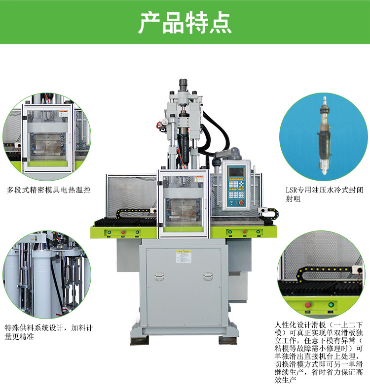 多段式精密鑄造黑色防靜電鑷子電暖溫控儀; LSR多功能氣動平衡自封油冷式圍合射咀提高認識從未漏膠; 獨特上料射得去構思,出料測量精準扶貧,射得去固定; 雙長板長板方案(一上二下模),可正宗保持單雙長板長板專門的上班,同樣下模有錯誤(沾模等錯誤代碼需檢修理時)可專門滑出單獨機臺下整理,添加滑模途徑既可以另一類單滑立刻分娩,省時保持平衡維持高效益分娩,